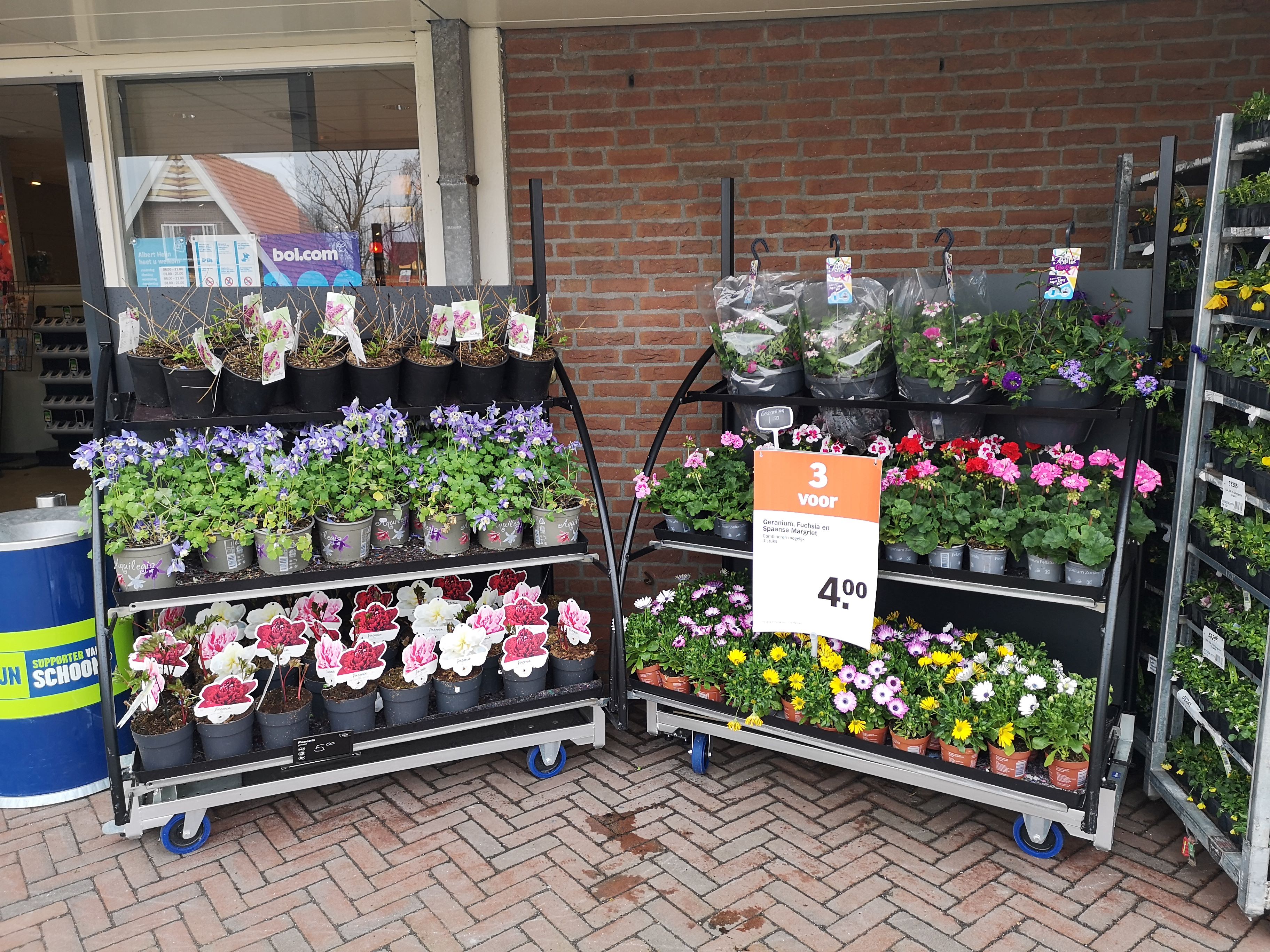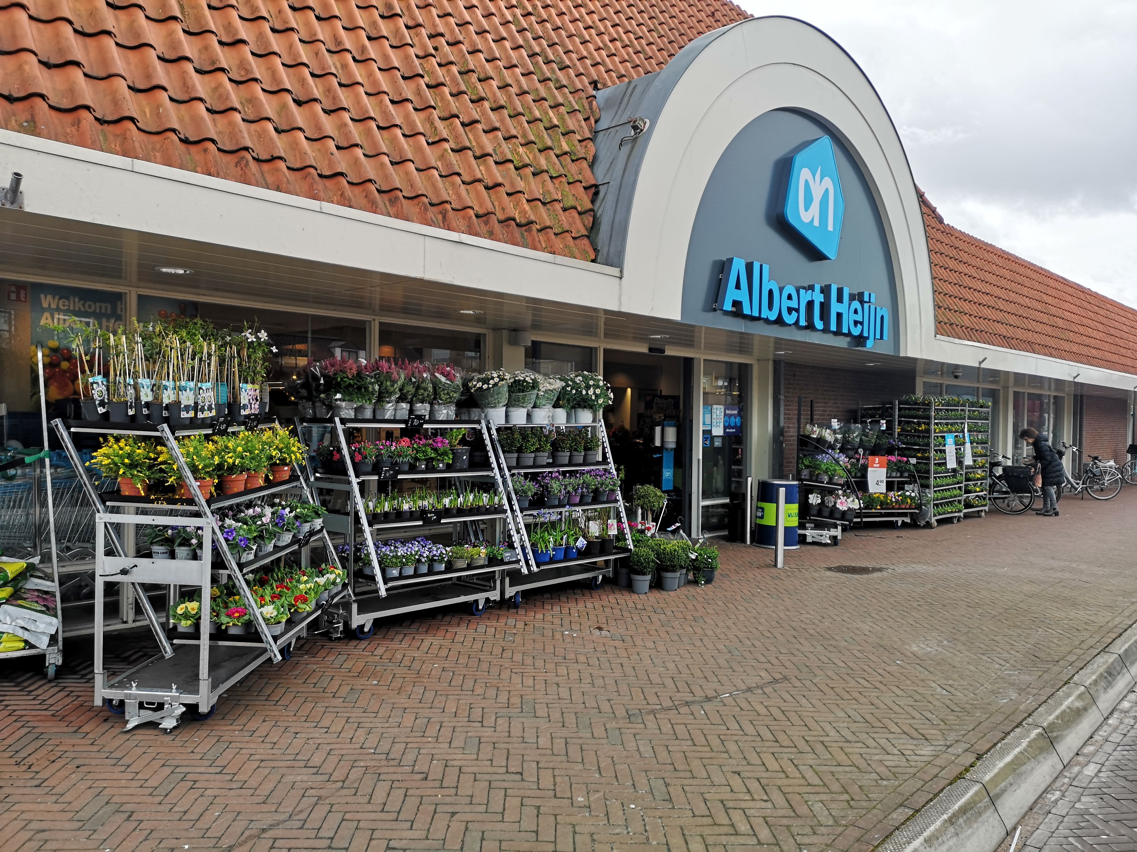 Après avoir repris la formule Deen, Albert Heijn était à la recherche de mobilier pour la présentation extérieure de ses plantes et fleurs. L'assortiment variant considérablement au cours de la saison, une solution flexible et modulaire s'imposait. Il était également très important que les chariots mobiles puissent être déplacés silencieusement (cela se produit très tôt chaque jour et doit donc être fait sans bruit) et les chariots devaient être équipés d'un système de freinage. Le Horti-Display et le Horti-Fllower ont été utilisés à cette fin, avec nos roues de type 4 silencieuses et sans vibrations. Les chariots sont maintenus en place par notre frein ronuust pour les chariots danois.
