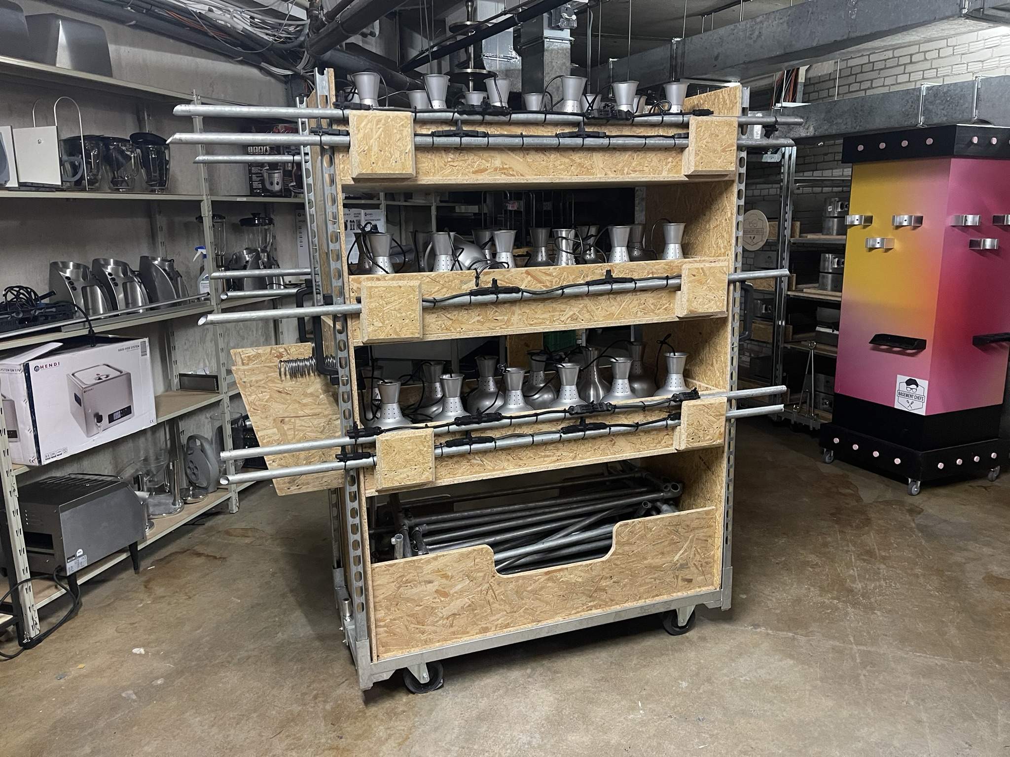 Dans la catégorie "que peut-on faire avec un chariot danois", nous ne pouvons et ne devons pas ignorer les Basement Chefs : outre la créativité dans la cuisine, cette équipe possède certainement de la créativité dans l'atelier. Après avoir acheté un chariot de bonne qualité avec les roues et les montants adéquats, ils construisent les chariots exactement comme ils le souhaitent. Chaque chariot a une fonction spécifique et est utilisé exclusivement à cette fin. Cela demande bien sûr du temps et de l'énergie, mais c'est disproportionné par rapport à l'achat d'une solution prête à l'emploi, qui n'est souvent pas à la hauteur.
