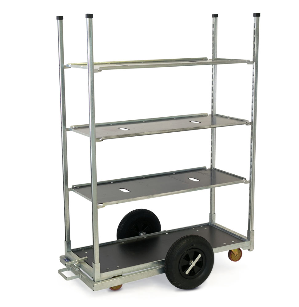 The pneumatic tyres (various sizes available) then make it very easy to move the trolley over unpaved terrain. Think of ground cover, root cover, a lava path or gravel.